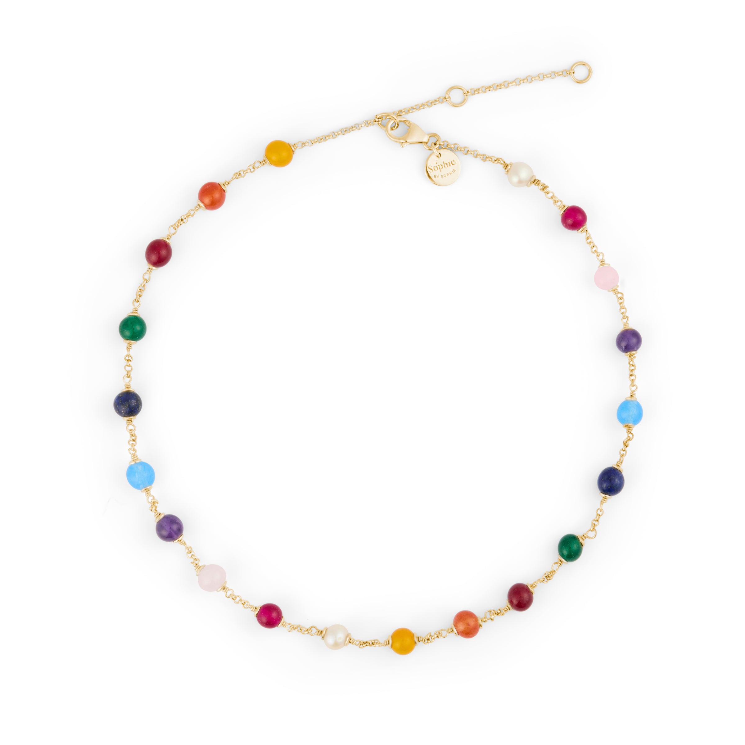 • Gemstones: Chalcedony, Pink Quartz, Purple Amethyst, Light Blue Chalcedony, Orange Carnelian, Blue Lapis Lazuli, Yellow Agate, Green Agate, Red Agate and Freshwater Pearl